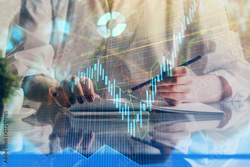 Financial forex graph drawn over hands taking notes background. Concept of research. Double exposure