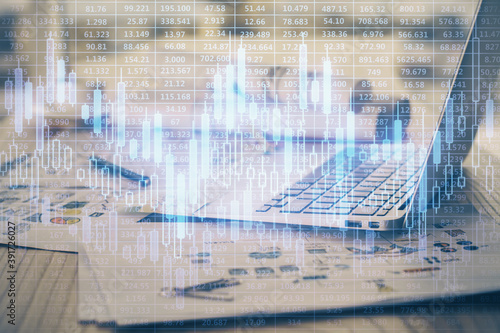 Financial graph colorful drawing and table with computer on background. Double exposure. Concept of international markets.