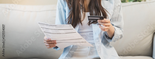 Financial household debt concept, stressed young asian woman trying to find money to pay credit card debt.