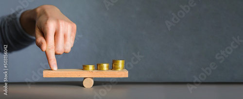 Financial Leverage And Money Balance. Finance And Price. Stacks of coins in a inflation chart and red arrow. Stack coin on wooden table with handwriting bar graph, dollar sign symbol and point up.