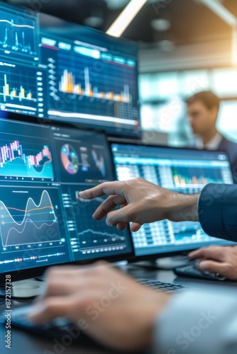 Financial Strategy Session with Data Analysis and Detailed Charts in Modern Office