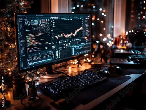 Financial Trading Monitors with Stock Market Charts and Festive Lights