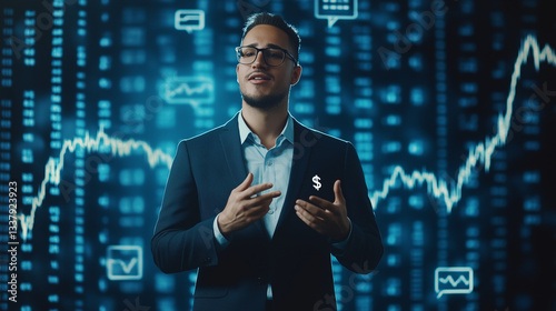 Financial Visionary: A confident business professional presents a data-driven analysis, standing before dynamic charts and graphs symbolizing growth and market trends.
