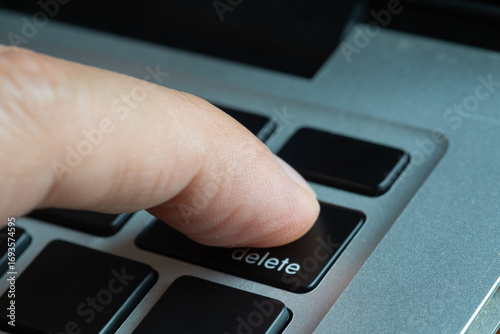 Finger of the computer user, he presses the delete button on the computer keyboard