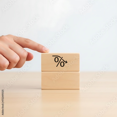 Finger pointing at a wooden block with a percentage symbol indicating financial concepts and savings opportunities