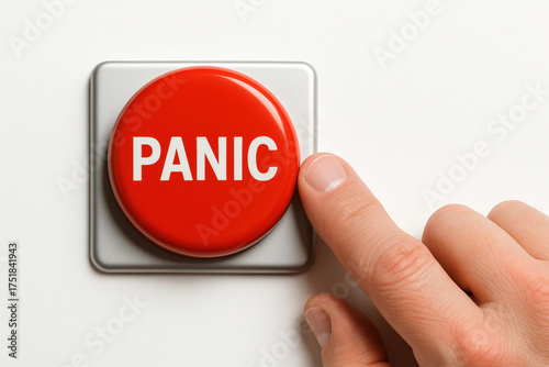 Finger pressing red panic button in emergency situation on white background