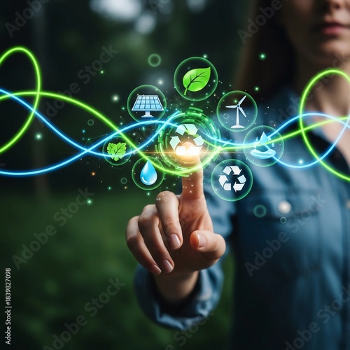 "Finger Touching Glowing Eco Energy Icons – Renewable Energy, Sustainability, Green Technology & Climate Solution"