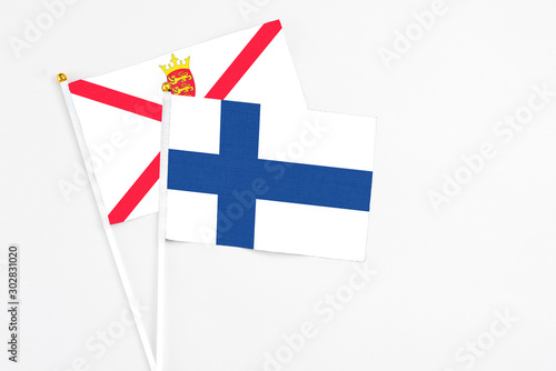 Finland and Jersey stick flags on white background. High quality fabric, miniature national flag. Peaceful global concept.White floor for copy space.