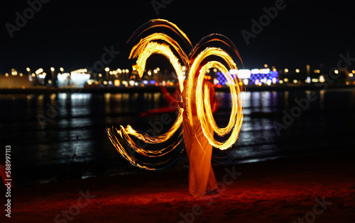 Fire dancers, swing fire dancing show. Create shapes from fire on a beach. Fire artists.