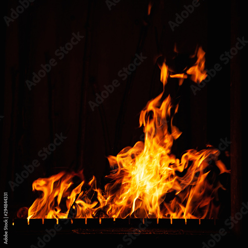 Fire flame on a dark background. Burning fire at night. Bright bonfire in the barbecue, fireplace and hearth.