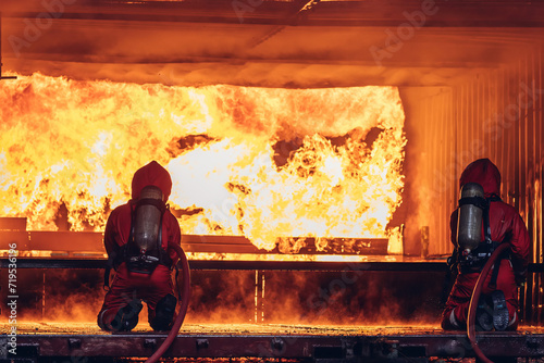 Firefighter Concept. Several firefighters go offensive for a fire attack. Fireman using water and extinguisher to fighting with fire flame.