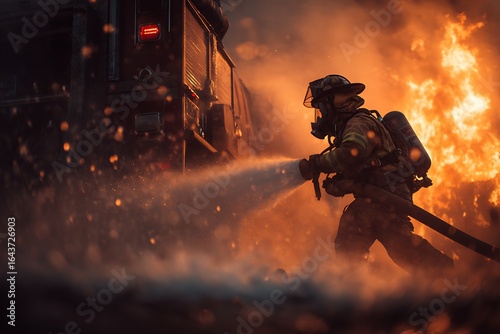 Firefighter extinguishing fire with firehose and firetruck in background