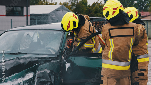 Firefighters using jaws of life to extricate trapped victim from the car. High quality photo
