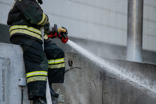 Firemen using extinguisher and water from hose for fire fighting in firefight training. Firefighter wearing fire suit for protect and safety under danger case.This team is under civil service system.