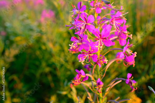 Fireweed Wildflower in Full Bloom – Vibrant Pink-Purple Flowers in a Meadow Bathed in Golden Sunset Light for publication, poster, calendar, post, wallpaper, cover, website. High quality photography