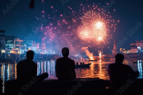 Fireworks illuminating the night sky over a crowded riverside during a festival