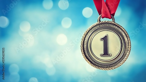 First place medal with a red ribbon against a blurred background.