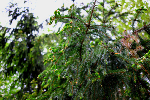 fir-tree branches covered with pine needles and young buds