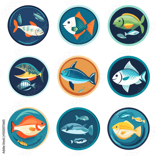 Fish Icons Collection, Colorful Cartoon Fish Set in Circle Frame Design