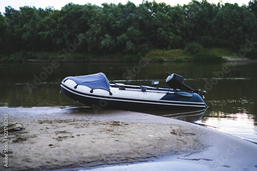 fisher inflatable motor boat on the sandy river bank at the dusk s