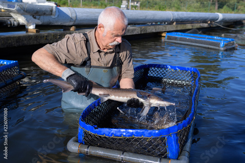fisherman holding a trout out of the water in fishfarm