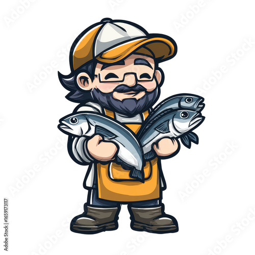 Fisherman with a catch of three fish wearing a cap and apron Seafood Fishing