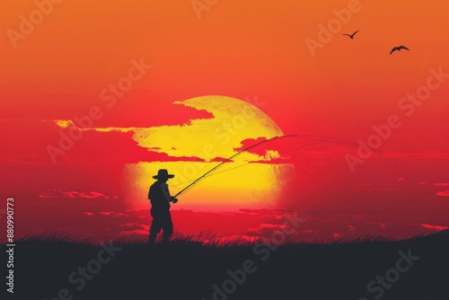 Fisherman with a fishing rod against the backdrop of a red sunset.