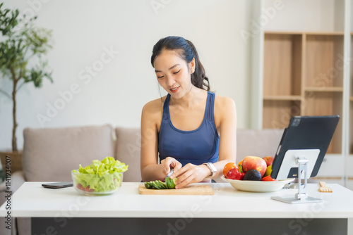 Fit woman enjoys healthy fruit breakfast after yoga training. fitness, nutrition, healthy lifestyle.
