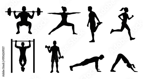 Fitness and Gym Workout Silhouette Vector Set: Weightlifting, Yoga, Stretching, and Running Characters