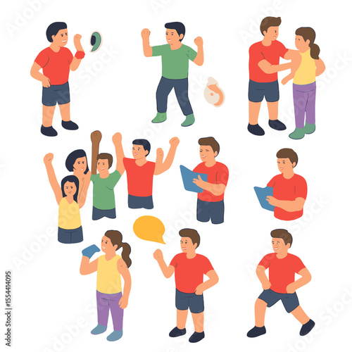 Fitness Instructor Icons. Isometric Flat icon set of fitness instructors and participants: instructor megaphone, motivated