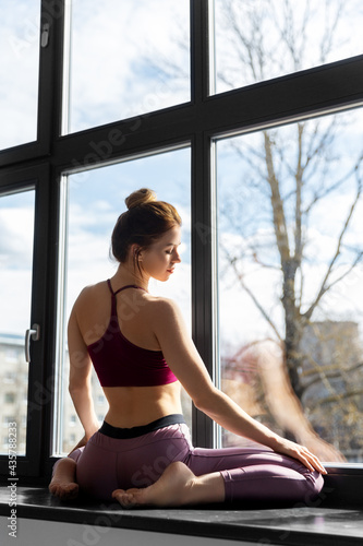 fitness, sport and healthy lifestyle concept - woman doing yoga exercise on window sill at studio