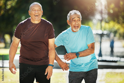 Fitness, walking and senior men in park for wellness, healthy body and wellbeing in retirement, Friends, happy and mature people with smile, laughing and joy outdoors for exercise, workout and sports