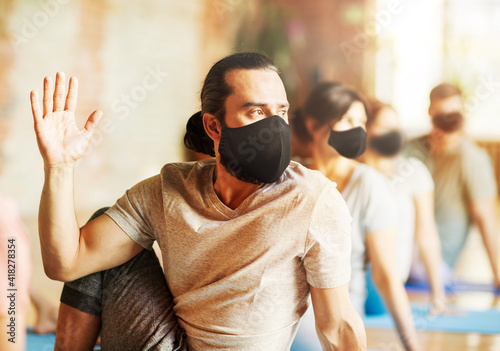 fitness, yoga and healthy lifestyle concept - man wearing face protective black masks for protection from virus disease with group of people doing half lord of the fishes pose in gym or studio