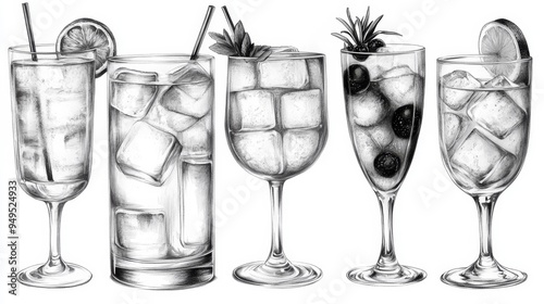 Five Assorted Cocktails in Sketch Style Generative AI