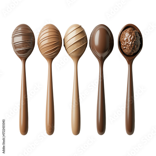 Five chocolate spoons showcasing various textures and colors, perfect for sweet treats and desserts.