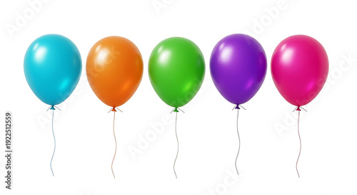Five colorful balloons floating against a white background in a row