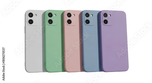 Five colorful smartphones lined up for display transparent background