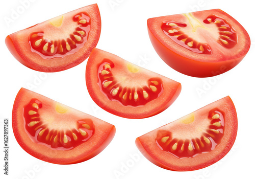 Five fresh tomato slices isolated on transparent background, showcasing their vibrant red color and juicy texture, perfect for culinary use