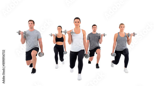 Five people are in various stages of a lunge exercise with dumbbells, focused and determined