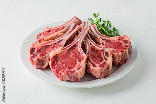 Five rib chops are neatly arranged on a white plate, showcasing their rich red color and marbling. Fresh herbs accompany the meat, perfect for grilling
