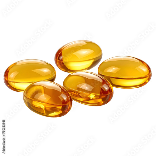 Five translucent, amber-colored softgel capsules sit isolated on a black background