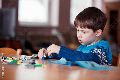 Five years old boy playing with building blocks