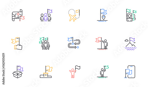 Flag line icons. Leadership, Goal Success, Winner with Flag. Navigation Map, Travel goal destination, People protest line icons. Mountain with Flag pole, Delivery box, Ownership. Vector