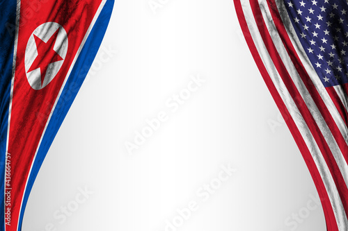 Flag of North Korea and the United States of America with theater effect. 3D illustration