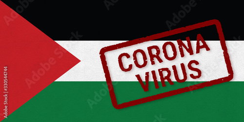 Flag of Palestine on paper texture with stamp, banner of Coronavirus name on it. 2019 - 2020 Novel Coronavirus (2019-nCoV) concept, for an outbreak occurs in the Palestine.