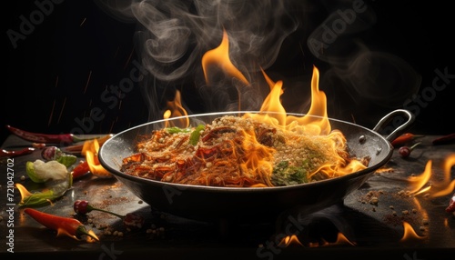 Flamed assortment of traditional indian food in a black saucepan with more ingredients around. Asian food ingredients on dark background. Oriental recipe with vegetables and spices. Generative AI.