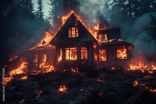 Flames engulf an abandoned house surrounded by dense forest during a wildfire in the evening light