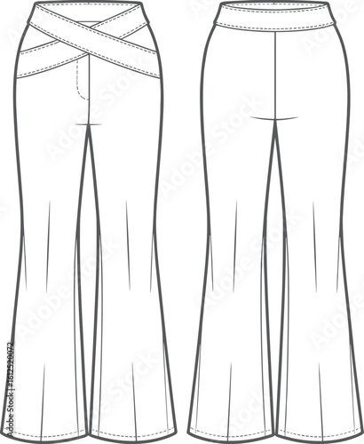 Flared pants technical flat sketch with crossover waistband, front and back view, fashion design template for clothing vector illustration