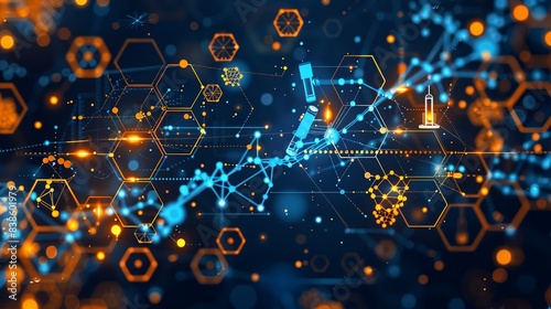 Flat color background with a mix of hexagons and circles, featuring detailed molecular structures and biotechnology components like microscopes and DNA strands. Flat color illustration, shiny,