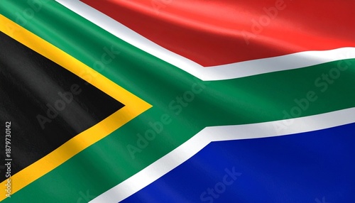 Flat digital rendering of South Africa’s national flag with six-color design and horizontal green Y-shape dividing black, yellow, red, blue, and white elements. Symbolizes unity and cultural diversity